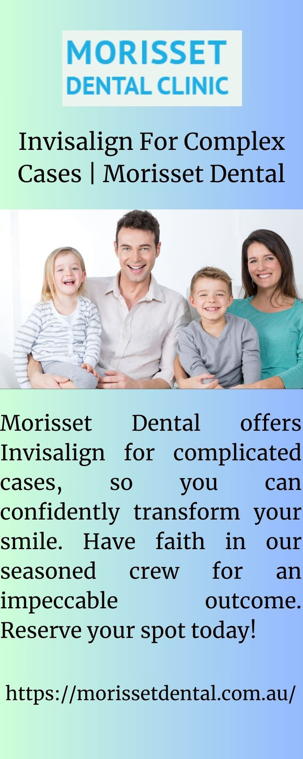 Morisset Dental offers Invisalign for complicated cases, so you can confidently transform your smile. Have faith in our seasoned crew for an impeccable outcome. Reserve your spot today!